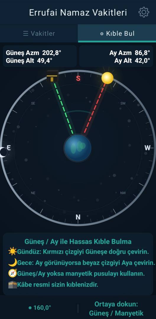 Not: (Yeni uygulamada Güneşe ve Aya göre hasas kıble ve bütün vakitleri grafik üzerinde gösterme ve her vakit için ayrı süreli ayarlanabilir alarm gibi müthiş yenilikler var. Eski Errufai uygulaması varsa kaldırdıkdan sonra yükleyebilirsiniz. Android 6-17 sürümüyle uyumludur. Görüş ve önerilerinizi Play storeye yorum olarak veya errufai@gmail.com mail atabilirsiniz)